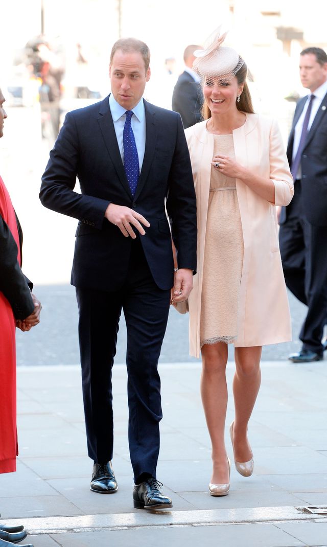 Сегодня же Кейт Миддлтон и принц Уильям посетили празднование 60-го юбилея коронации королевы Елизаветы. На торжество Кейт пришла в кружевном мини-платье нежно-розового цвета, а также в стильном плаще и шляпке, завершив образ любимыми бежевыми лодочками и клатчем.