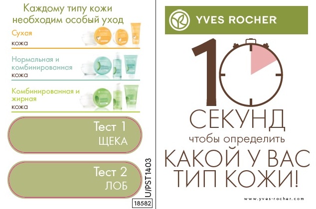 Чтобы выбрать идеальную косметику для своей кожи, необходимо, в первую очередь, правильно определить свой тип кожи. Сегодня это сделать очень просто: для этого тебе понадобится лишь тест Yves Rocher. Состоит из двух полосок и позволяет буквально за 10 секунд определить свой тип кожи.