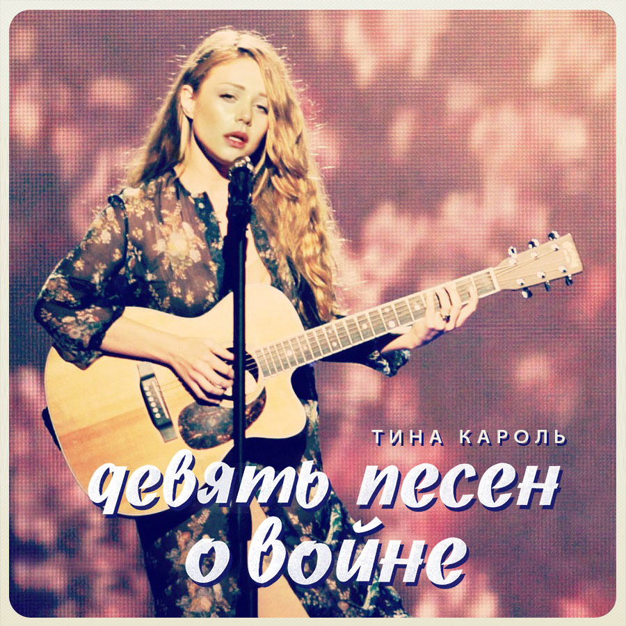 Обложка альбома военных песен выполнена в ретро-стиле и напоминает советскую пластинку. На фото Тина Кароль аккомпанирует себе на гитаре в наряде от Ulyana Sergeenko.
