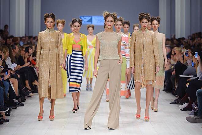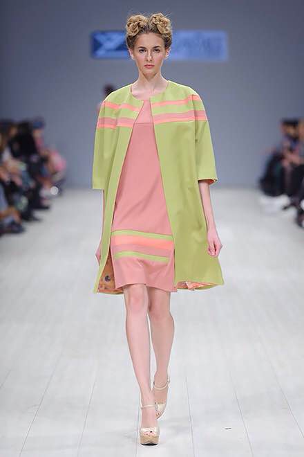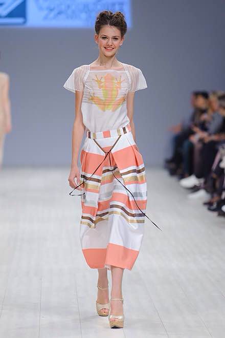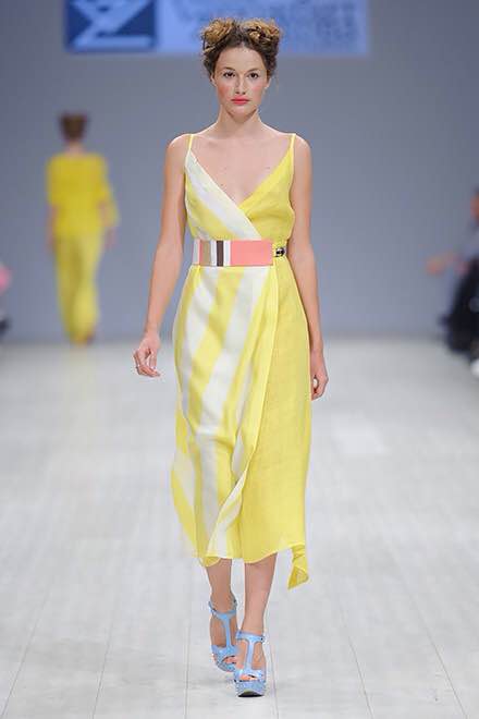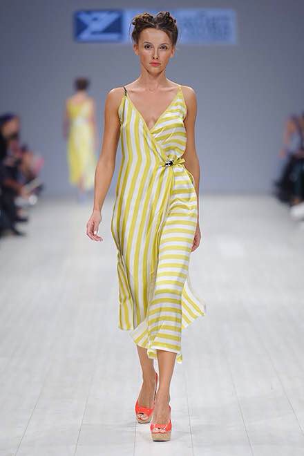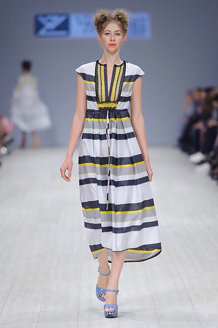 Цветовая палитра коллекции Vorozhbyt&Zemskova получилась по-летнему яркой. Доминирует нежные цвета неспелого персика и теплые краски абрикоса. Для контраста модельеры использовали широкую полоску глубокого синего и черного цветов.