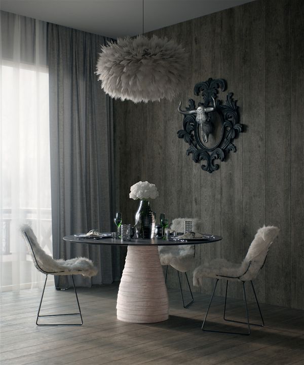 Торшер и обеденный стол сделаны с очень фактурными глиняными ножками, которые напоминают украинские мазанки, но без намека на «шароварщину» в дизайне.