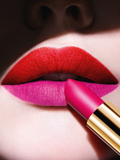 Создайте неимоверную глубину с помощью двух оттенков: соедините насыщенный оранжево-красный с мощным розовым. Подчеркните форму губ, нанеся TOUCHE ÉCLAT на лук Купидона. Нанесите на верхнюю губу ROUGE PUR COUTURE THE MATS N° 201, а на нижнюю – N° 215.