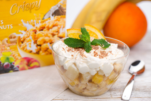 Для приготовления возьми полстакана хрустящих мюсли AXA Crispy медовые с фруктами и орехами, 100 грамм консервированного ананаса, половинку банана, апельсина, 100 грамм обычного йогурта, немного корицы и листьев мяты.