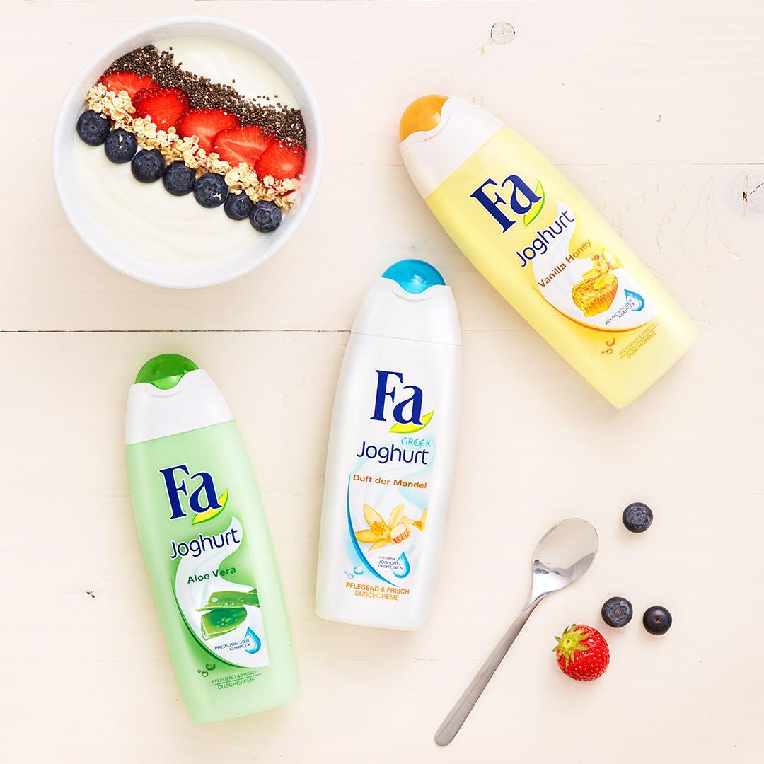 Линейка крем-гелей для душа Fa: "Ванильный мед", "Алоэ вера", "Греческий йогурт" – понравится самым взыскательным гурманам. Протеины йогурта давно известны своими полезными свойствами: они возвращают коже упругость и гладкость. А нежная кремовая текстура средств деликатно очищает ее, не пересушивая.