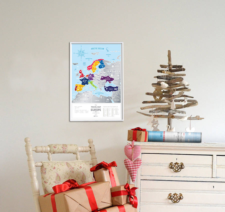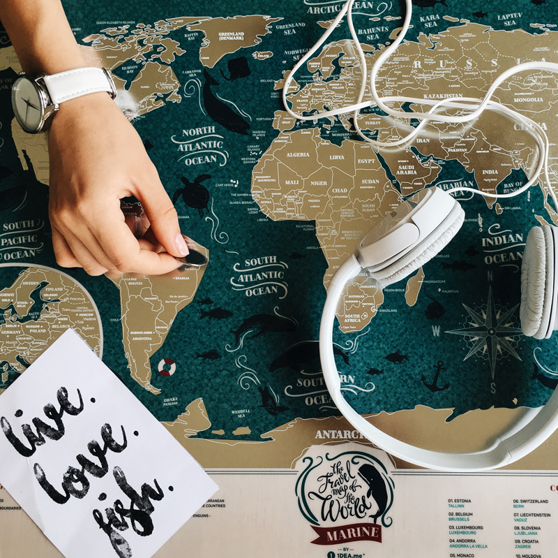 Также очень качественная и долговечная, красивая, но с другим, не менее оригинальным дизайном: страны под скретчем – красные, а стильные авторские иллюстрации местных обитателей – красивые и информативные. Эта карта более компактная, яркая, подойдет для детей и подростков – Travel Map Marine.