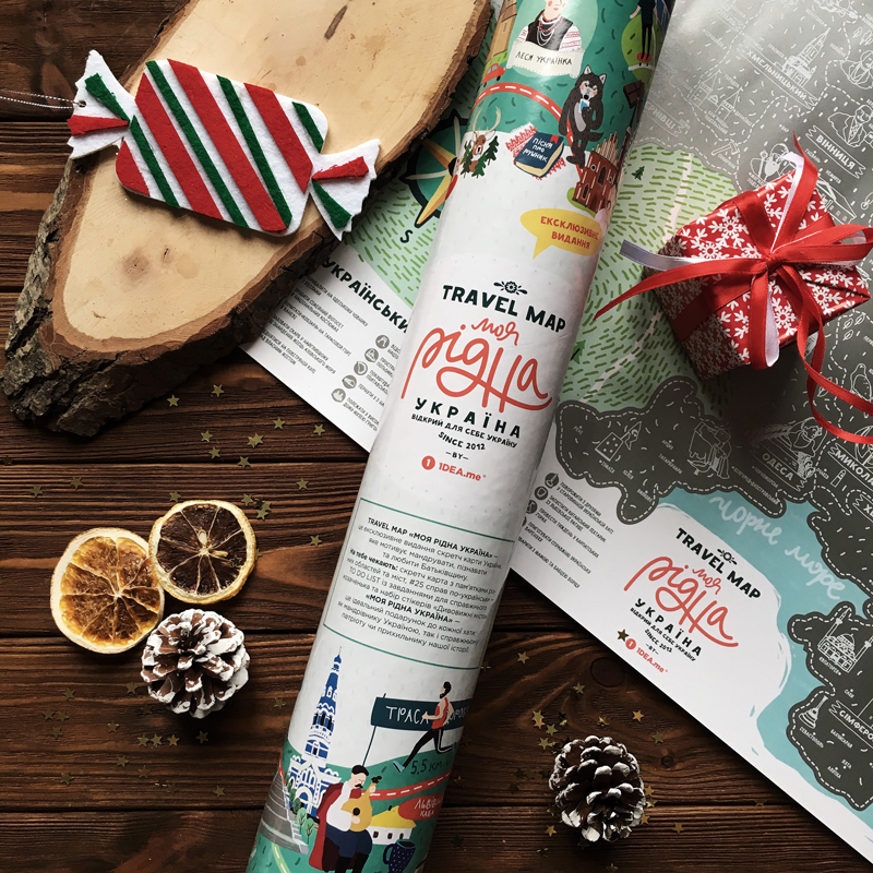 Travel Map Моя Рідна Україна – прекрасный мотиватор путешествовать по любимой стране. Яркий дизайн, список 25 дел по-украински, наклейки с обзорными маршрутами по крупнейшим городам Украины, качественная ламинированная бумага… Прекрасный подарок для настоящих патриотов. И весьма бюджетная.