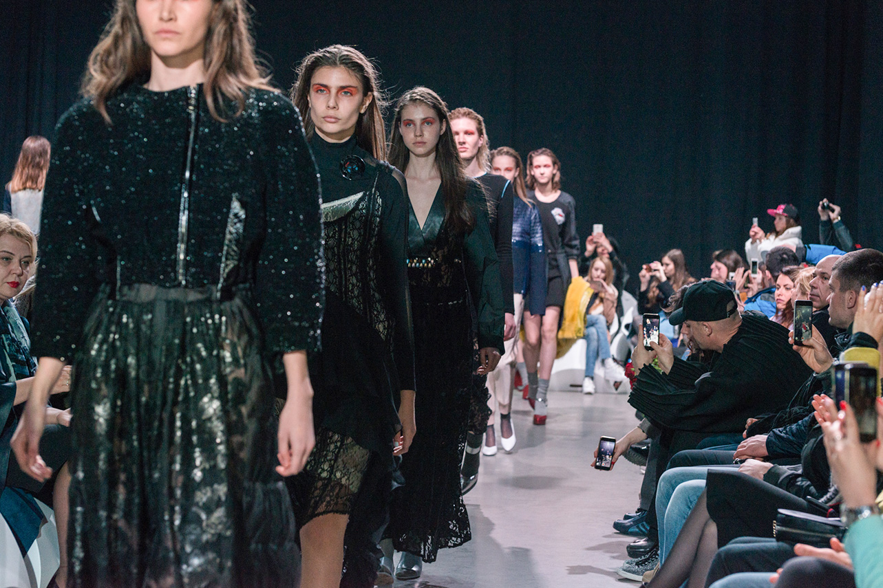 Показ состоялся в абсолютно черном пространстве, рассеченном белыми рядами футуристических стульев. Модели спускались в зал со второго уровня по металлической лестнице и дефилировали среди рядов по П-образной траектории. Стиль задавал бьюти-партнер KAFO.