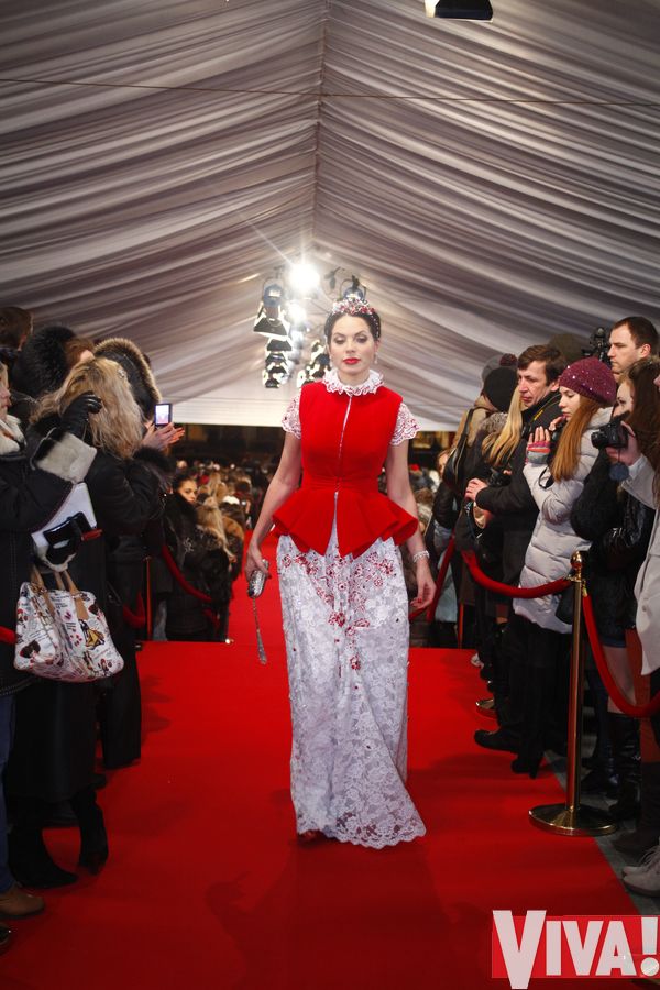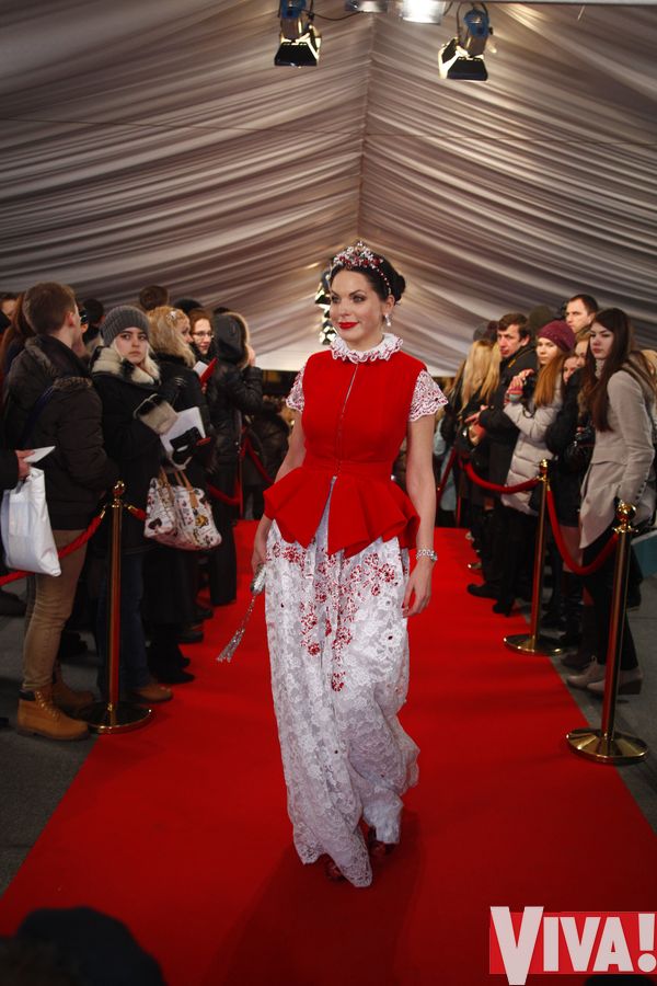 Главное весеннее событие года "VIVA! Самые Красивые 2012" Влада Литовченко решила встретить в образе самой Весны. Благодаря кружевному белому платью с красным жилетом-баской от Елены Бернацкой и изысканной диадеме с драгоценными «ягодами» от Елены Романовой Влада смогла гармонично воплотить продуманный look.