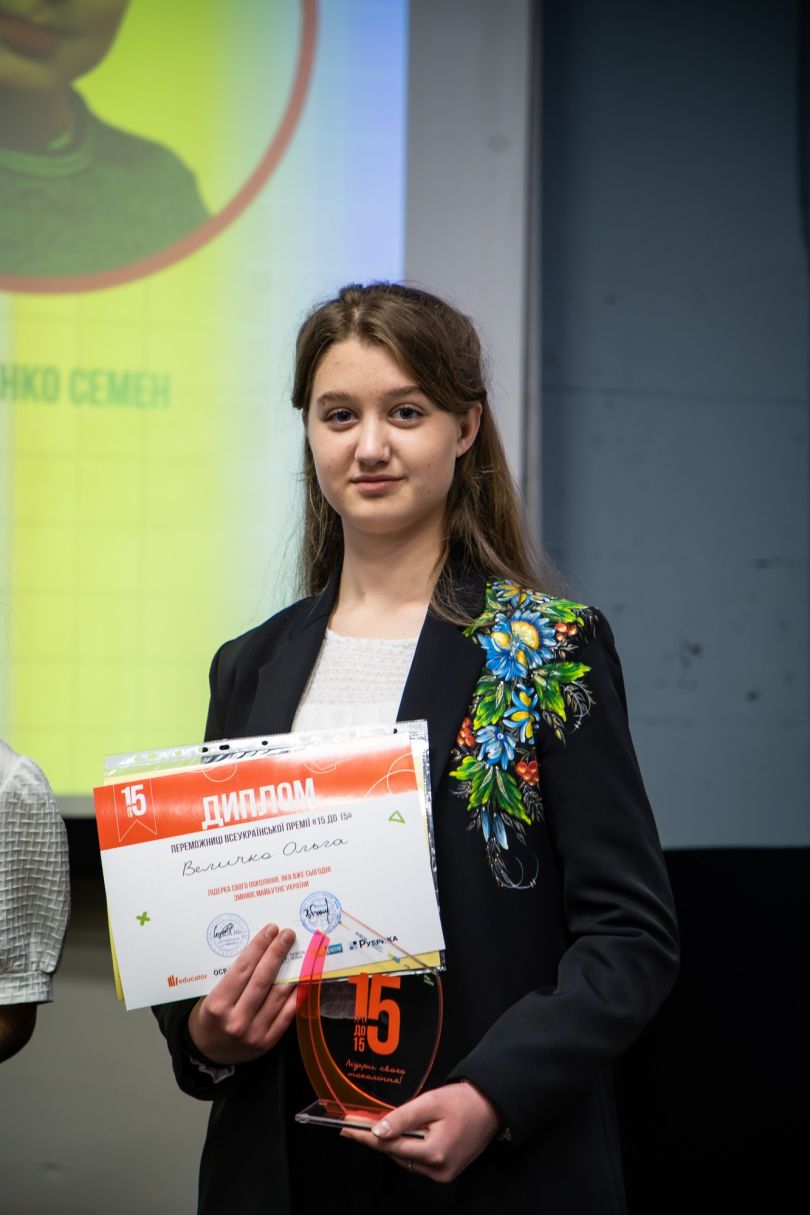 • 2. Величко Ольга, 15 років, м. Ірпінь (художниця, переможниця та лауреатка всеукраїнських конкурсів; її роботи експонуються за кордоном у рамках культурної дипломатії України; є членом команди екологічної просвіти, активно бере участь у еко-ініціативах).