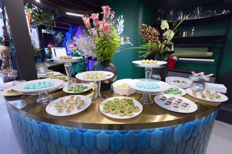 Для гостей підготували авторський фуршет у виконанні шеф кухарів Кулінарної Студії "ОК", який поєднав в собі елементи молекулярної кухні, технічного особистого пропрацювання різних текстур та поєднань. Дуети солодкого та гострого, пікантного та терпкого та інших текстур. Презентація шпинатних основ та подача відомих страв в іншій інтерпртитаці (Наприклад, Тарталетка "Том Ям"). Всіх пригощали українським вином європейської якості Villa UA.