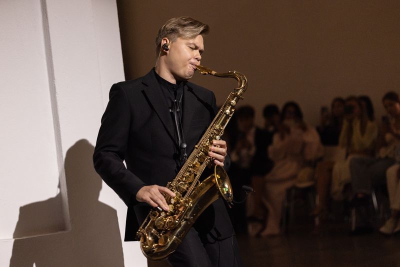 ПІд час показу сцену наповнила жива музика — саксофоніст створив атмосферу стриманої емоційності, підкресливши контраст між тишею ліній і глибиною звучання. Це поєднання стало невід’ємною частиною концепції AXIOM — сили без слів.