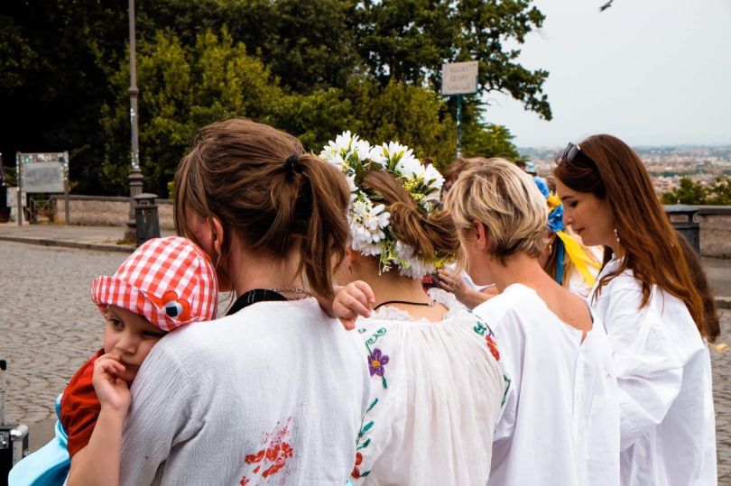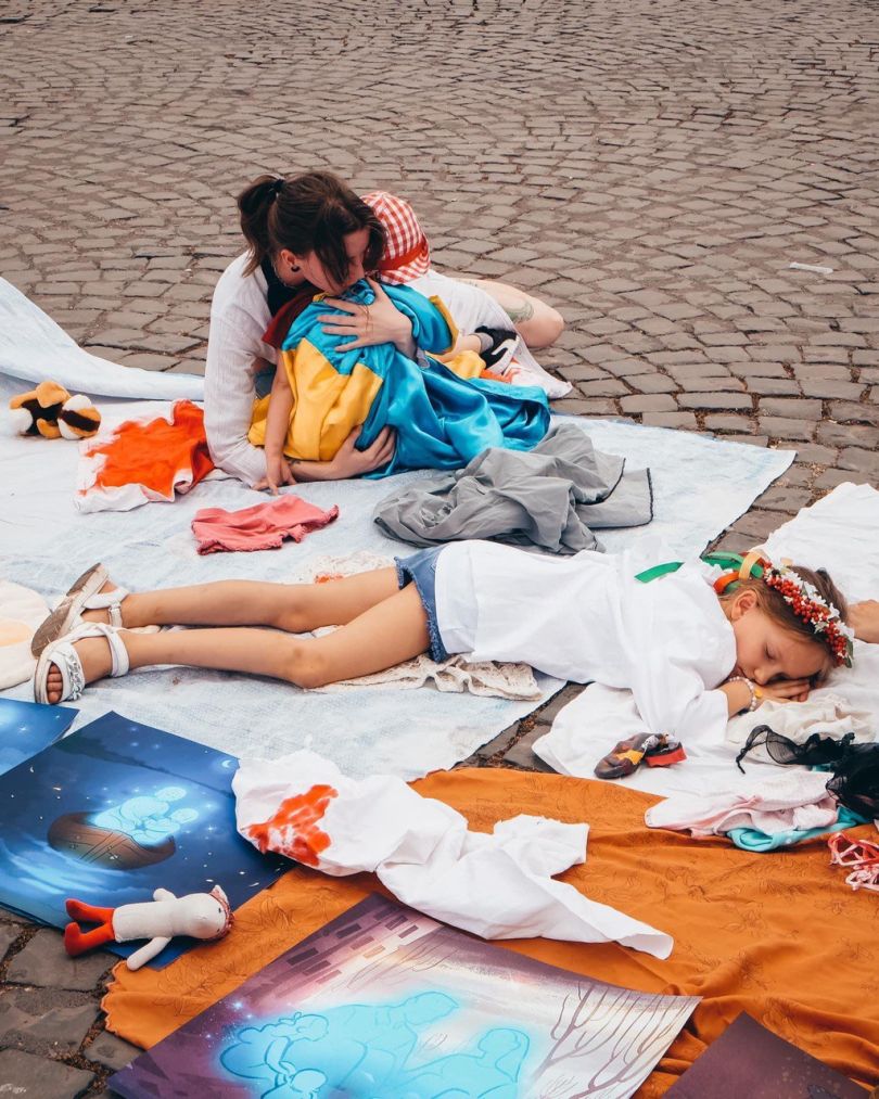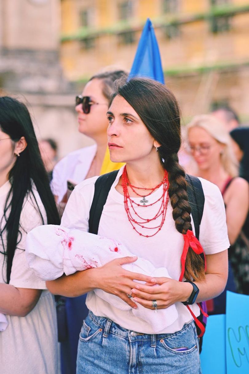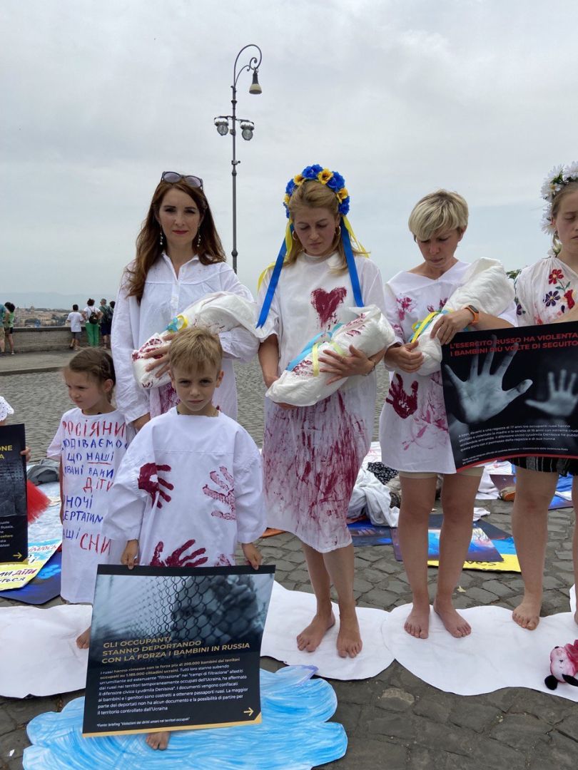 На площі Piazza Garibaldi у Римі дівчата з руху Марш Матерів представили перфоманс для місцевих жителів та туристів – мовчазну живу інсталяцію у вигляді закривавлених привидів жінок і дітей в пам’ять про постраждалих, зґвалтованих та померлих дітей України. До руху також приєдналися співробітники Посольства України в Італії.