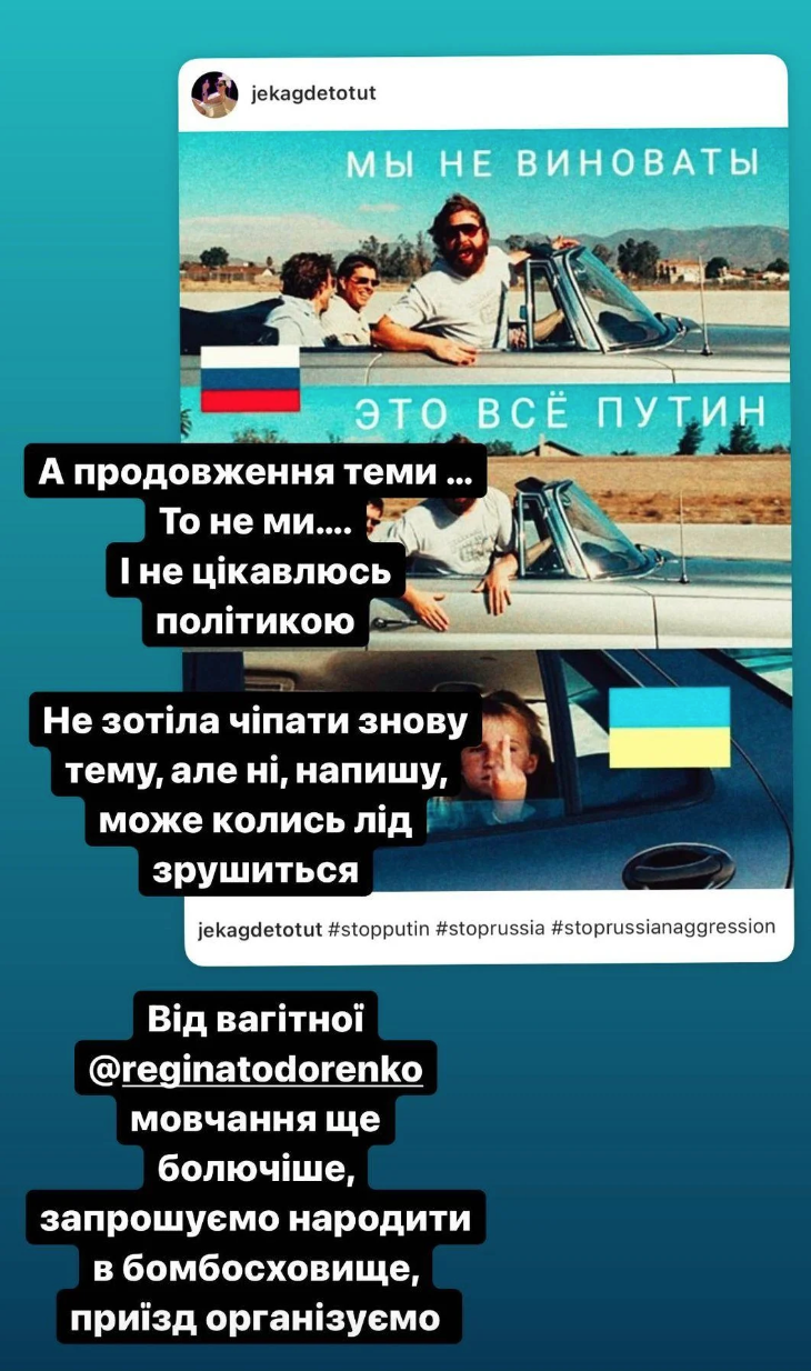 Колеги з українського шоу-бізнесу намагались достукатись до телеведучої, однак спроби виявились марними. Нещодавно стало відомо, що Регіна Тодоренко вдруге вагітна від російського співака Влада Топалова. Очевидно, саме це стало причиною, чому вона боїться вголос підтримати Україну і засудити злочинну військову агресію рф, тим самим вплинувши на численну російську аудиторію своїх прихильників. Нагадаємо, з 24 лютого росія вбила 145 українських дітей. Ще 222 отримали поранення. Мільйони дітей і жінок змушені були тікати з дому — хто за кордон, хто в інші регіони України.