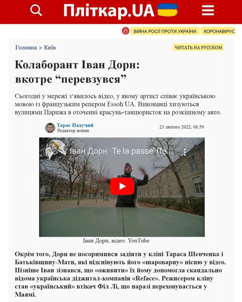 Новина із заголовком "Колаборант Дорн вкотре перевзувся" з'явилася в соцмережах після виходу треку "Te la passe", записаного в дуеті з артистом з Івано-Франківська Essoh. У матеріалі автор критикує музиканта за те, що він "не посоромився задіяти у відео образи Тараса Шевченка та Батьківщину-Мати", а також використав уривок із хіта Воплі Водоплясова "Були на селі".