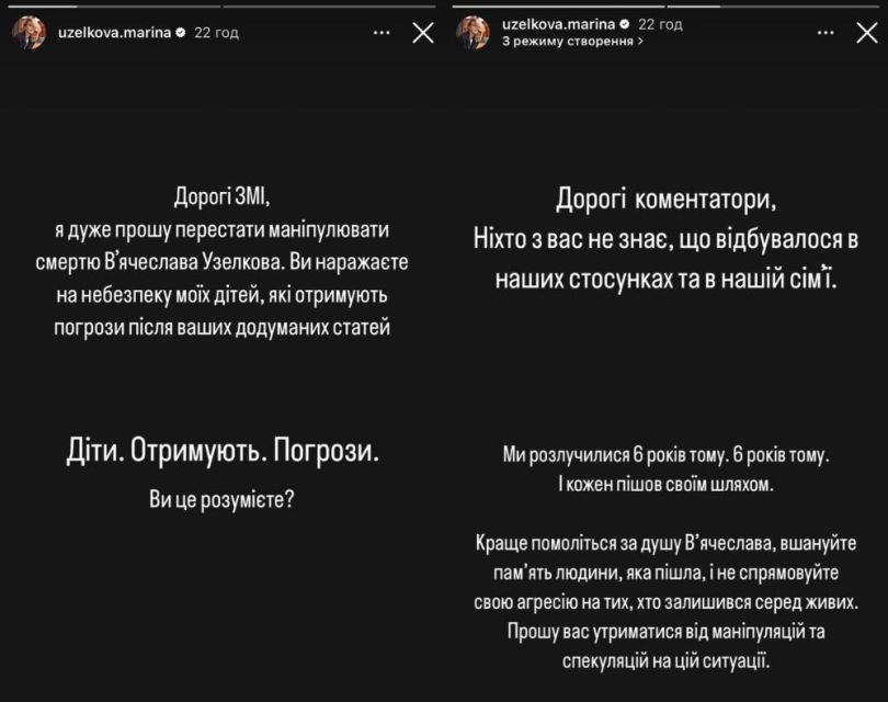 «Дорогі коментатори, ніхто з вас не знає, що відбувалося в наших стосунках та в нашій сімʼї. Ми розлучилися 6 років тому. 6 років тому. І кожен пішов своїм шляхом. Краще помоліться за душу Вʼячеслава, вшануйте памʼять людини, яка пішла, і не спрямовуйте свою агресію на тих, хто залишився серед живих. Прошу вас утриматися від маніпуляцій та спекуляцій на цій ситуації», — підкреслила вона.