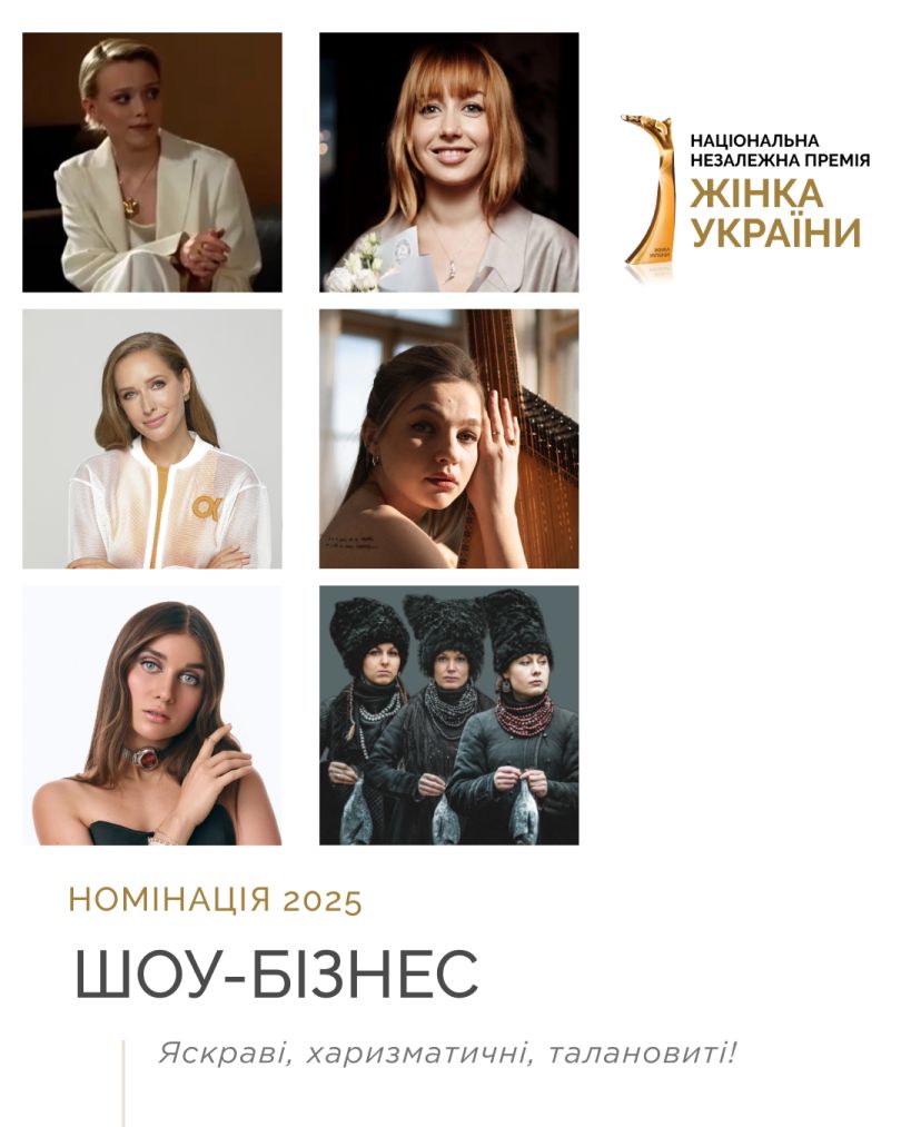 У номінації «Шоубізнес» зібрані яскраві представниці творчого світу: голлівудська зірка Іванна Сахно, співачка Jerry Heil, учасниці культового гурту «ДахаБраха» — Олена Цибульська, Ірина Коваленко та Ніна Гаренецька, режисерка світових музичних кліпів Таню Муніо, бандуристка й композиторка Марина Круть, а також телеведуча Катерина Осадча. Вони популяризують українську культуру у світі, задаючи тренди й не втрачаючи зв’язку з корінням.