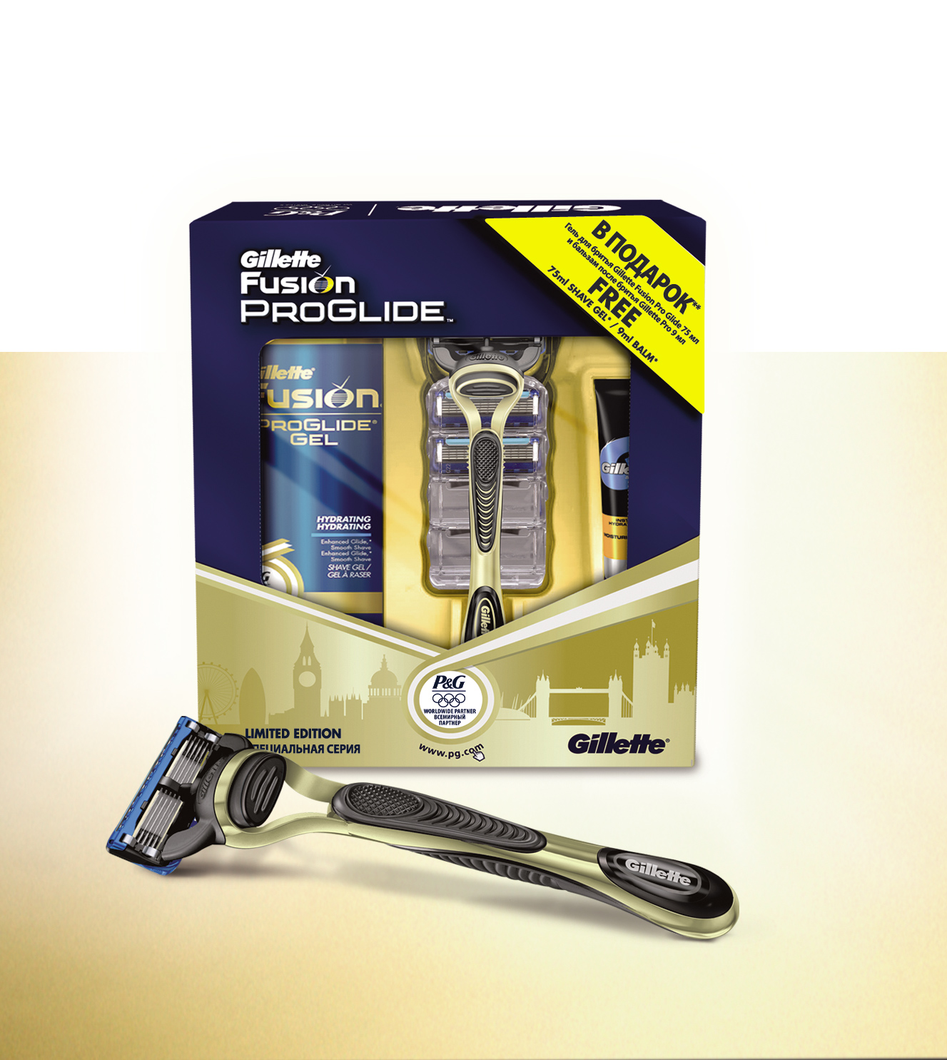 В честь кампании в поддержку атлетов на Олимпийских играх 2012 в Лондоне Gillette выпустил специальную серию наборов, которые подарят каждому мужчине уверенный старт дня. В набор вошли бритва Gillette Fusion ProGlide Power золотого цвета, гель для бритья Gillette Fusion ProGlide увлажняющий и бальзам после бритья Gillette Pro 3-в-1 в специальном дизайне.
