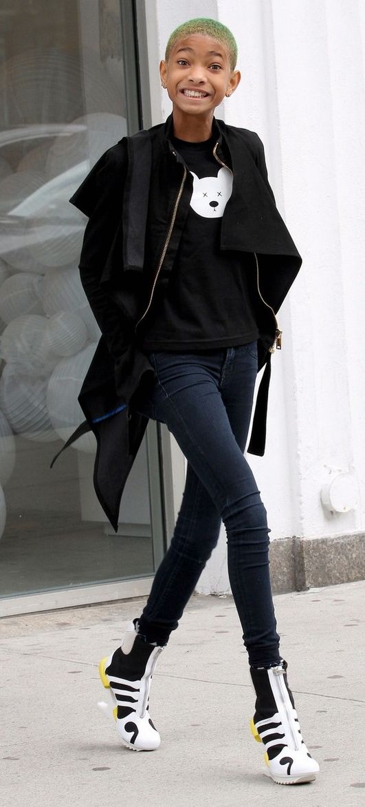 А с недавних пор Уиллоу продемонтрировала еще и новый цвет, едва отросших волос. Девочка остановила свой выбор на модном в этом сезоне ярко-зеленом. Но и это еще не все. Младшая Смит продолжает эпатировать публику. На днях папарацци встретили ее на выходе из магазина одежды в Нью-Йорке, где девушка оставила кругленькую сумму. Выглядела Уиллоу очень стильно и намного старше своих лет. Не смотря на то, что девчушке всего лишь 11 лет, на ее и без того длинных ногах красовались причудливые ботиночки на высоченных каблуках-копытцах. Завидев папарацци Уиллоу начала улыбаться и откровенно кокетничать с ними проявляя отличное расположение духа.