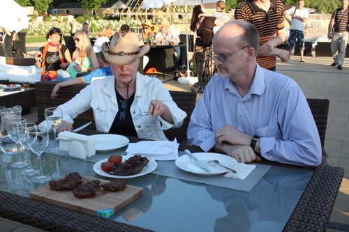 Уже на входе всех встречали девушки, в костюмах в стиле кантри, которые провожали вновь прибывших гостей на специальную площадку у бассейна, где на нескольких грилях, ведущие шеф-повара готовили вкуснейшие стейки. По тому, как все это благоухало, это было понятно сразу.