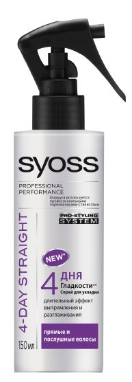 Мечта многих из нас – безупречно прямые и гладкие, как шелк, волосы. Однако выпрямление волнистых или курчавых волос с помощью щетки, фена или утюжков отнимает немало времени и усилий, а результат, как сон, исчезает на следующее утро. В полной мере насладиться профессиональными результатами выпрямления волос в домашних условиях нам поможет выпрямляющий спрей SYOSS «4 дня гладкости». Его формула, которая активируется теплом фена или утюжков для выпрямления волос, на 4 дня подарит нам блестящие, прямые и гладкие волосы.