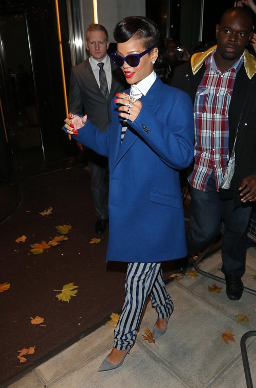 На днях певица была сфотографирована в Лондоне в невероятном наряде – модный нынче пижамный стиль звезда дополнила мужским пиджаком ярко-синего цвета. Смелый эксперимент пришелся по душе модным критикам, которые уже сейчас пророчат успех мужскому пиджаку на хрупкой женской фигуре.