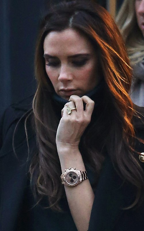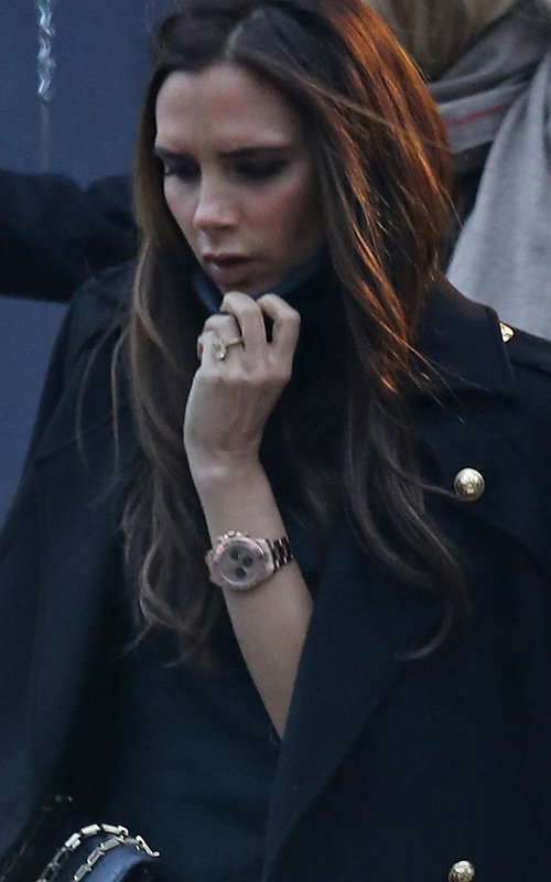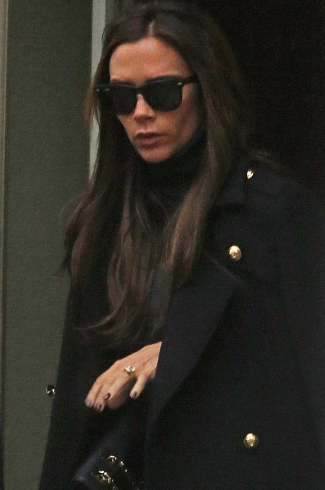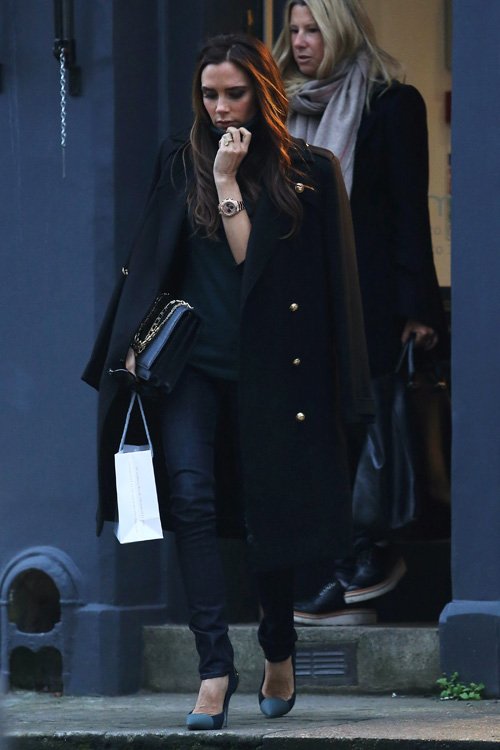 38-летняя красотка появилась на публике в длинном черном пальто с золотыми пуговицами, темных джинсах-скинни и черном гольфе. Свой casual-образ Виктория дополнила роскошными часами и стильной сумочкой.