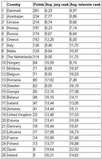 Организаторы "Евровидения-2013" полностью завершили все подсчеты голосов и опубликовали таблицу с результатами всех финалистов конкурса: