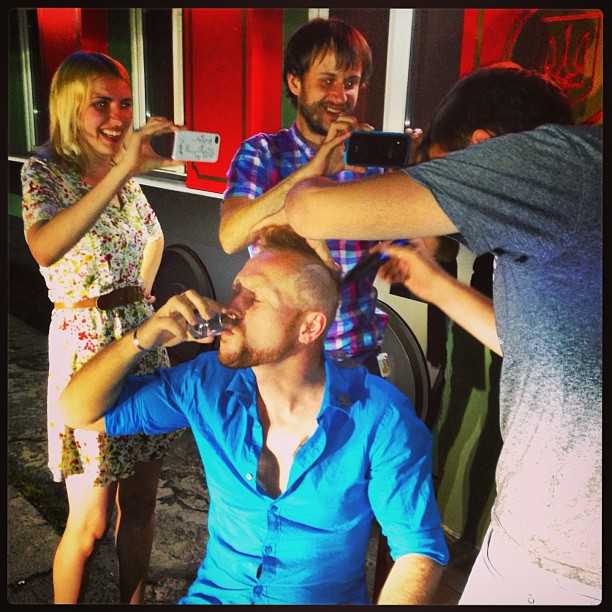 «Ось таким побачив себе наранок у дзеркалі. Вчора гуляв своїх любимих співробітників "МИ Production" за успішний перший телесезон авто-шоу "Тачки"! Перед п'янкою влаштували гонки на картах. Моя улюблена ставка - як не виграю брию голову.. І тут режисер мене обійшов! Звісно на саму п'янку взяли два трімера, а поголити директора налисо - то шикарний фінал душевного корпоративу!» - поделился Посыпайко.