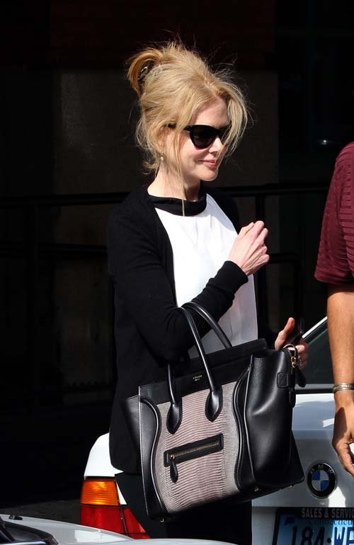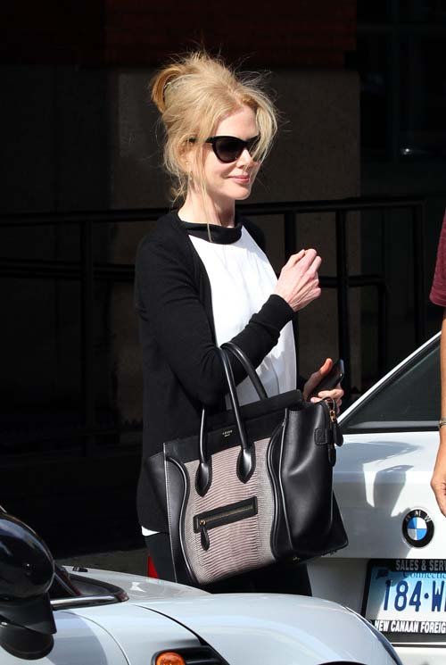 46-летняя красотка появилась на публике в стильном черно-белом легком свитере, джинсах «скинни», в черных солнцезащитных очках и со знаменитой сумкой Celine «Luggage Bag» серо-черного цвета.