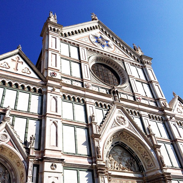 "Санта-Кроче. Внутри - усыпальницы Галилея, Микеланджело и пустая могила Данте".