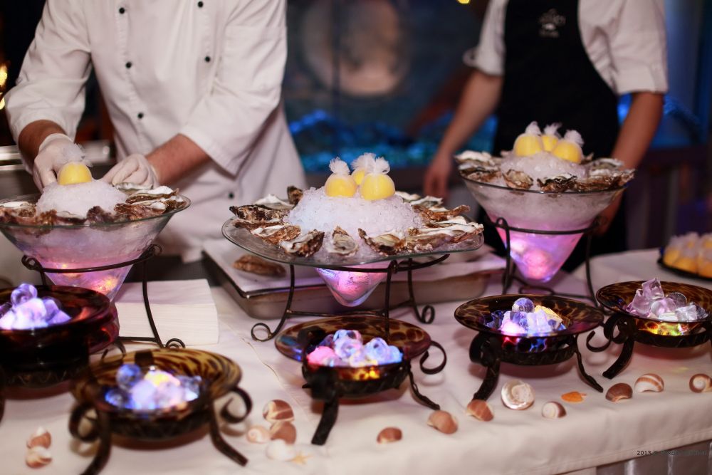 В качестве аперитива гостей угощают бокалом итальянского игристого вина просекко и предлагают попробовать обязательные элементы меню закусок – вкуснейший тартар из тунца с соусом от шеф-повара, нежное карпаччо из лосося, отличные итальянские антипасти и, конечно, свежие устрицы. А как трудно отказаться от креветок фламбе и отменных итальянских олив с хрустящим белым хлебом! Все традиционно закулисные кухонные процессы – приготовление рыбы, ризотто или креветок, подготовка устриц к подаче и наполнение бокалов игристым – происходят прямо на глазах у гостей вечера.