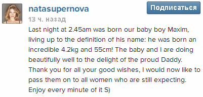 "Прошлой ночью, в 2:45 утра родился наш сын Максим, оправдавший значение своего имени: вес 4,2 килограмма и 55 сантиметров роста! И я, и малыш чувствуем себя превосходно – к радости гордого папочки. Спасибо вам всем за добрые пожелания, я бы хотела передать их всем тем женщинам, которые находятся в положении. Наслаждайтесь каждой минутой!" – написала Водянова.