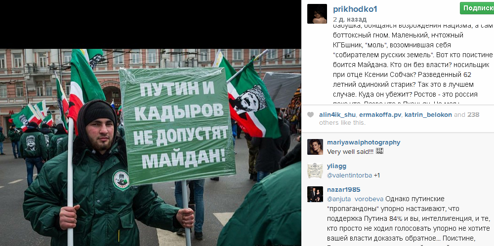 Согнанные с регионов студенты, трепетно держащие портреты Кадырова "чечены", ряженая казачня, пенсионеры, пришедшие за гроши, люмпены и маргиналы "за идею", и все это под истерику Цыгановой, "хирурга" и Лепса со Стариковым. Казалось бы - Бог с ним! Все эти лакеи из страха будут целовать пятки Путину. Это понятно. Но мне стало понятно другое - главный трус здесь не "кадыровский" манкурт, не ряженый дурак в папахе с погонами генералиссимуса и не бабушка, боящаяся возрождения нацизма, а сам боттоксный гном. Маленький, ничтожный КГБшник, "моль", возомнившая себя "собирателем русских земель". Вот кто поистине боится Майдана. Кто он без власти? Носильщик при отце Ксении Собчак? Разведенный 62-летний одинокий старик? Так это в лучшем случае. Куда он убежит? Ростов - это Россия пока что. Разве что в Пхеньян. Но могу успокоить - в России действительно Майдана не будет. Народ не тот. Он без царя не может. Будет тихий дворцовый переворот, в результате которого Путин станет врагом народа и его на сегодняшний момент верные "ватники" первые его разорвут, узнав об этом со слов Киселева. А пока гуляй, немытая Россия! "Русская водка" и "Рюмка водки на столе" звучат для тебя. А нам строить новую, прекрасную, богатую страну!"