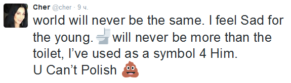 «Мир уже никогда не будет прежним. Мне грустно за молодежь», — написала в Твиттере Шер, сравнив Дональда Трампа с унитазом.