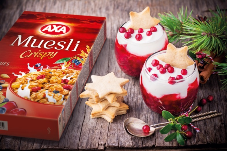 Клюкву перетираем с 2 столовыми ложками сахара, мюсли измельчаем. Смешиваем в блендере творог, йогурт и 1 столовую ложку сахара. Выкладываем слоями в порционные креманки в следующем порядке: слой клюквы, слой мюсли, опять слой клюквы и слой творожной массы. Перед подачей украшаем ягодами клюквы. Такой десерт лучше всего сочетается с рождественским печеньем.