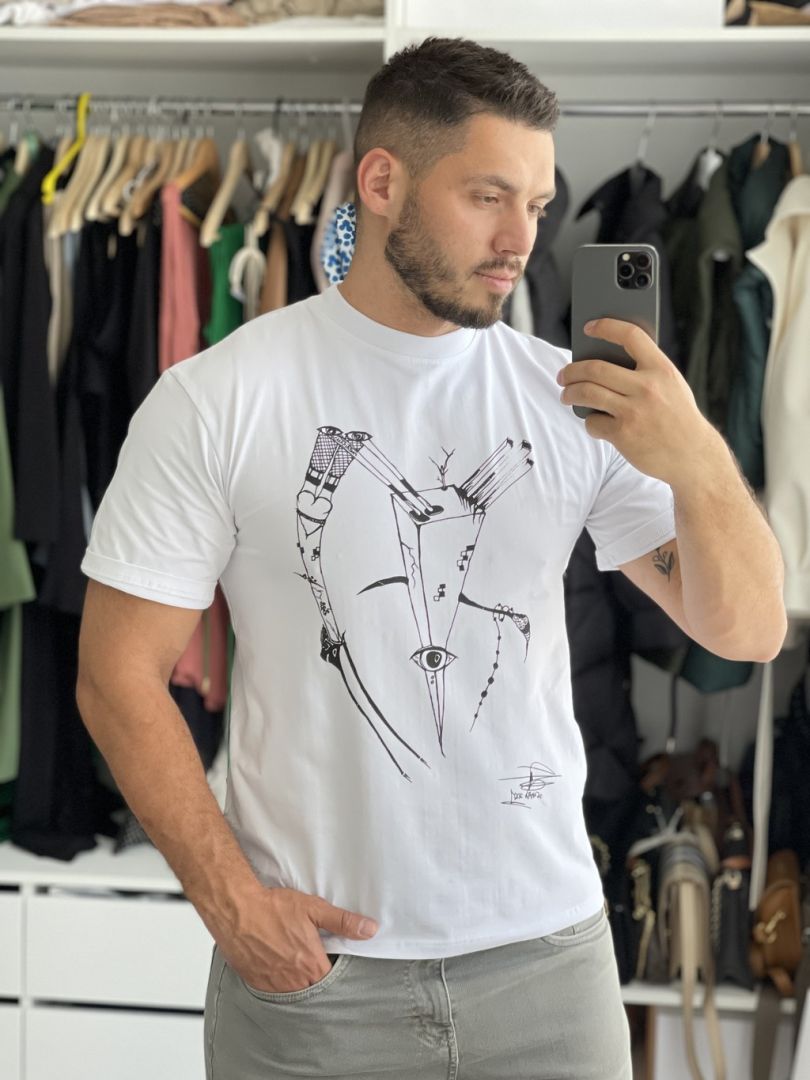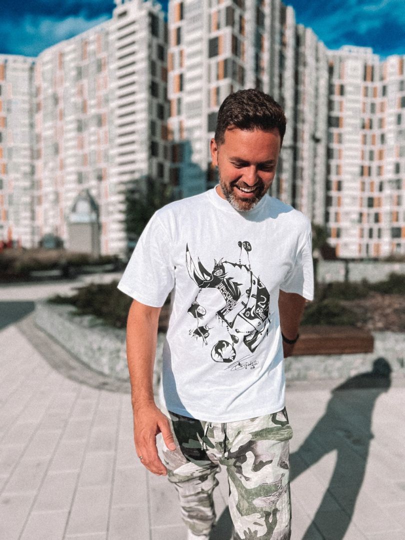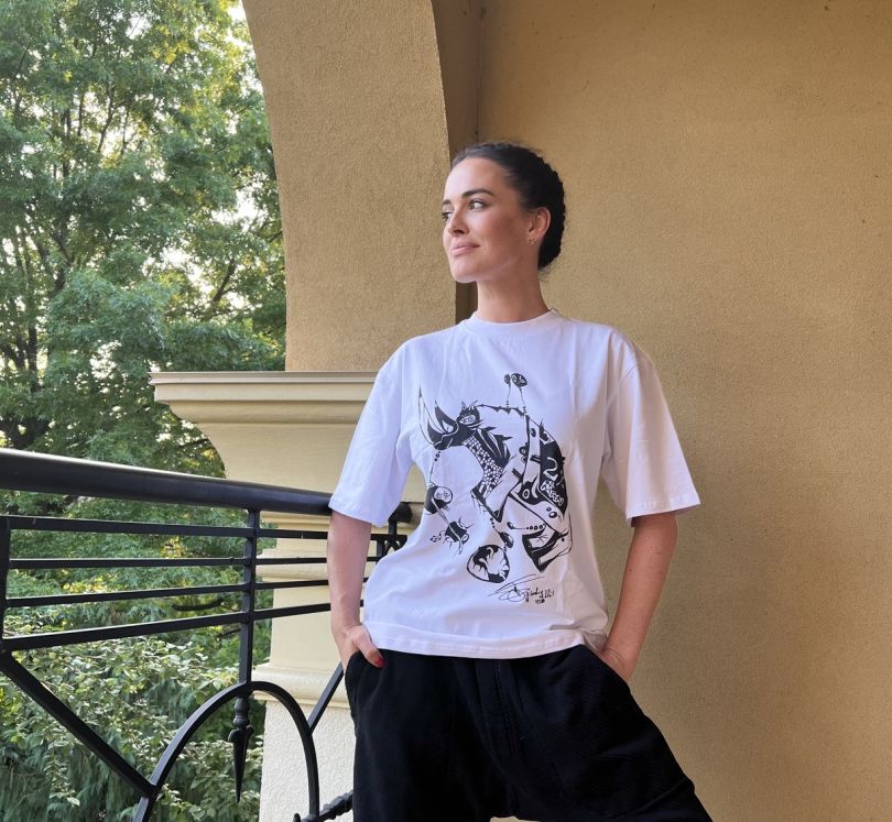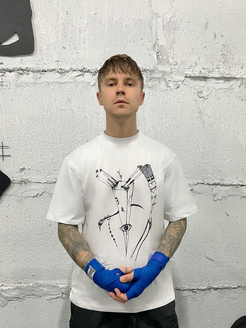 Колекція футболок білого кольору з принтами виставлена на продаж на сторінці проєкту в Instagram, вартість футболки становить 999 грн.