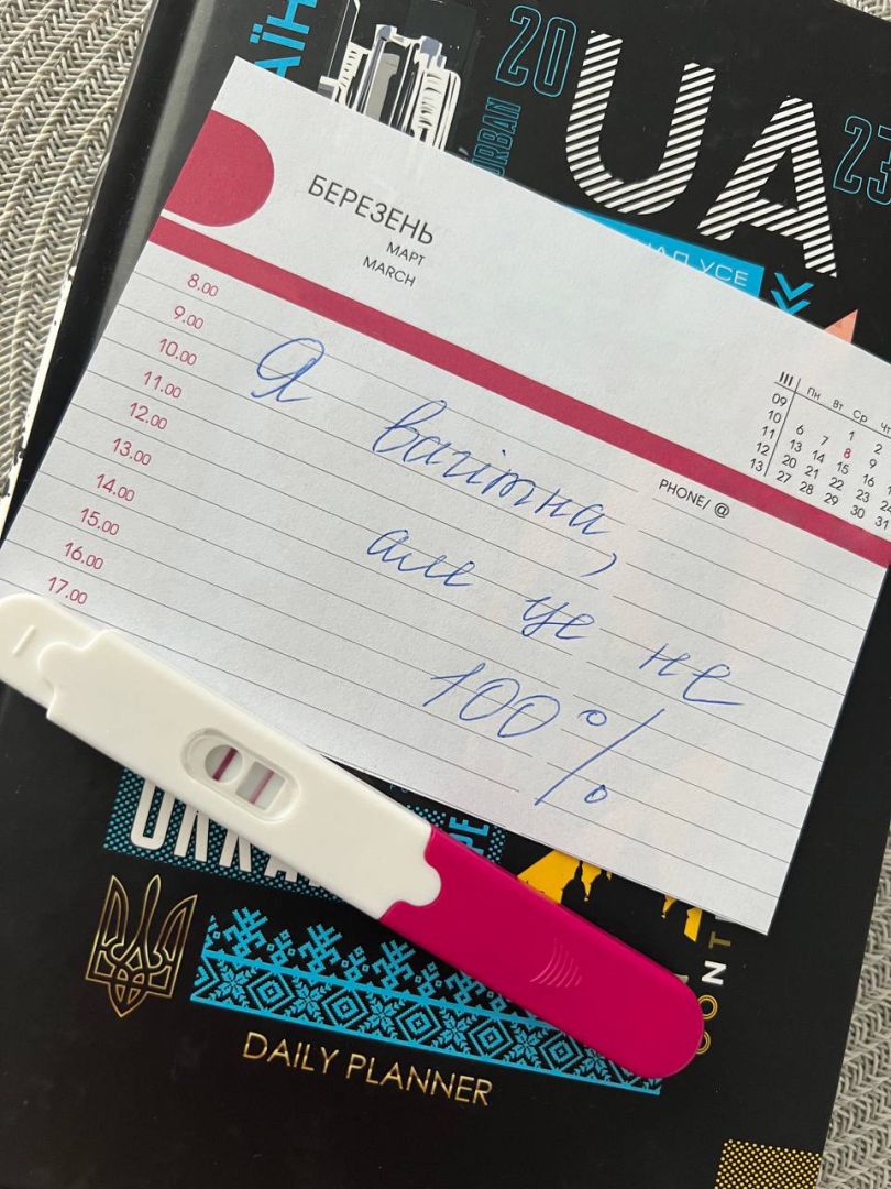 «Чоловікові я залишила записку. Чому написала: «не 100%», бо, як бачите на фото, друга смужка проявилась не повністю. У мене були певні сумніви, але все одно вирішила повідомити про це коханому», — поділилася ведуча.