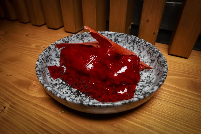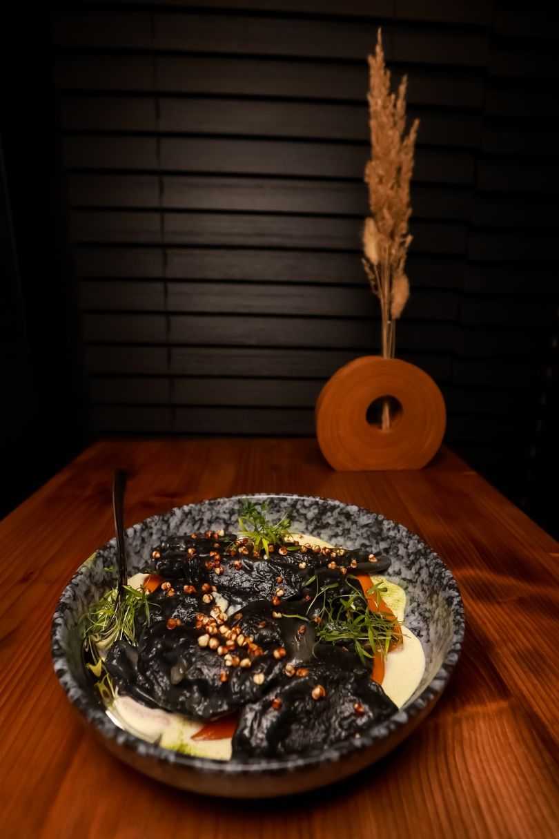 «Розробляючи концепцію кухні ресторану SAZHA, – розказує шеф-кухар Юрій Діденко, – ми одразу вирішили, що чорний колір сажі з печі має знайти своє відображення у стравах та декорі. Так з’явилося багато страв повністю або частково забарвлених у цей колір! Наш фірмовий паштет «Сажа» – чорного кольору, подається на чорній тарілці з чорним хлібом та ожиновим соусом. До борщу ми подаємо чорні пампушки. Вареники та піца у нас теж чорні. Також використовуємо чорні елементи при декоруванні страв. Кольору сажі і наш посуд: тарілки, соусники, горнятка».