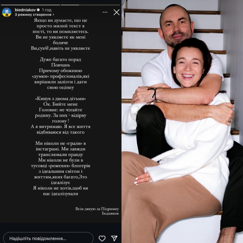 «Якщо ви думаєте, що це просто милий текст в пості, то ви помиляєтесь. Ви не уявляєте, як мені боляче», — написав він. Бєдняков не став приховувати обурення через нав'язливі поради та різкі оцінки з боку публіки, зокрема коментарі про те, що він нібито «кинув дружину з двома дітьми». «Дуже багато порад, повчань. Причому обожнюю «думки» професіоналів, які вирішили залізти і дати свою оцінку», — додав ведучий.