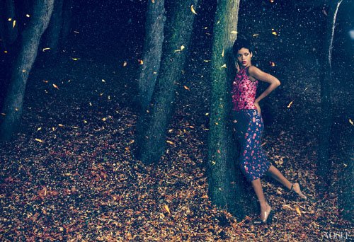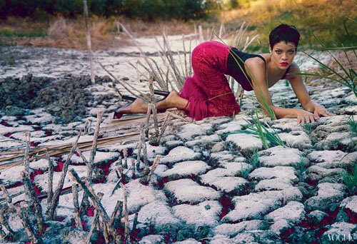 Барбадосская красотка появилась на обложке ноябрьского номера глянцевого журнала в ярко-красном платье, подчеркивающем стройную фигуру и сексуальность артистки. Примечательно, что на обложке «Библии моды» Рианна появляется уже в четвертый раз – певица украсила 2 обложки американского Vogue, и дважды появлялась на обложке журнала в других странах.