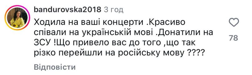 • «Ходила на ваші концерти. Красиво співали українською мовою. Донатили на ЗСУ. Що привело вас до того, що так різко перейшли на російську мову?».