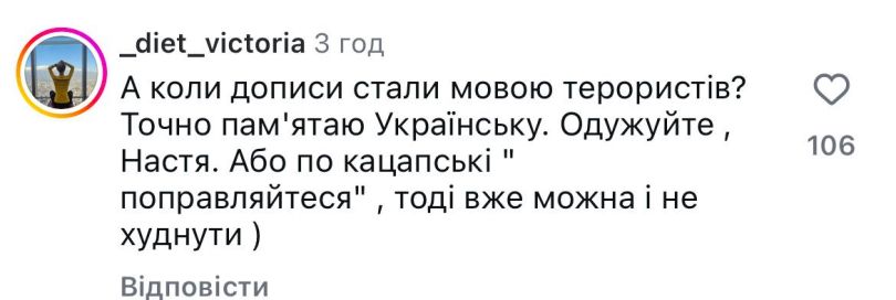 • «А коли дописи стали мовою терористів? Точно пам’ятаю українську. Одужуйте, Настя, або по-кацапськи - "поправляйтеся". Тоді вже можна і не худнути».