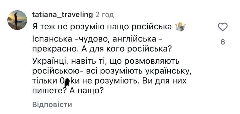 • «Я теж не розумію, нащо російська? Іспанська – чудово, англійська – прекрасно. А для кого російська? Українці, навіть ті, що розмовляють російською, всі розуміють українську. Тільки о*ки не розуміють. Ви для них пишете, а нащо?».
