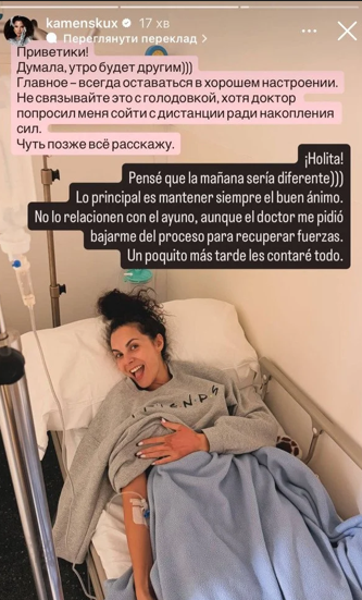 На своїй інстаграм-сторінці співачка поділилася світлиною, на якій вона лежить під крапельницею у палаті. Каменських зазначила, що це не пов’язано з її тижневим голодуванням. Раніше артистка повідомляла, що планує відмовитися від їжі не лише заради схуднення, але й для очищення думок. Відтак медики порадили їй припинити голодування, щоб відновити сили.