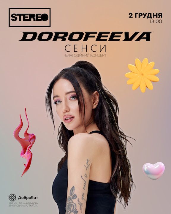DOROFEEVA с самого начала войны ведет активную социальную деятельность: выступает с благотворительными концертами во многих странах Европы, приобщается к социальным инициативам и создает благотворительные проекты, поддерживает украинских беженцев по всему миру, собирает средства на восстановление разрушенного жилья, популяризирует украинскую культуру и обращает внимание на важность сохранение украинского культурного наследия.