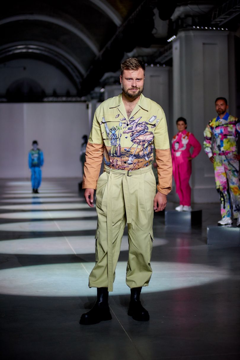 Продюсер шоу «Твій день» та член журі проекту «Вдягни Українське мистецтво» Єгор Гордєєв продемонстрував комбінезон з елементами стріт-арту. Єгор – киянин і обрав твір з відповідною історією – про те, як мистецтво врятувало міський простір. Художник – Дмитро Фатум – відомий мураліст з Києва зробив фреску, на якій закарбував залізних роботів, що реально зупинила вандалів. Досі фасад магазину біля Житнього ринку нахабно псували.