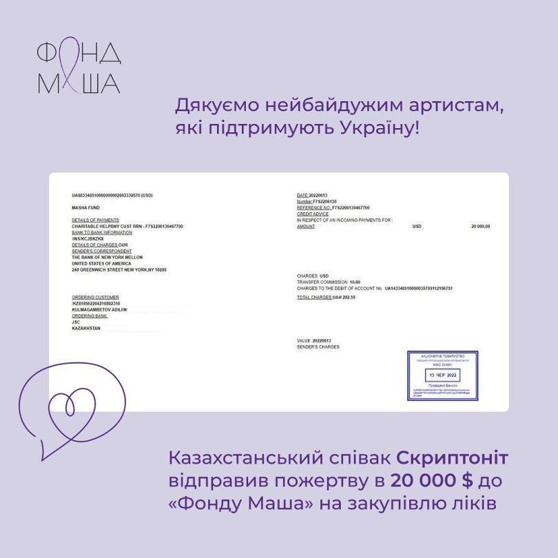 Україну співак підтримує не лише публічними висловлюваннями – до «Фонду Маша» Маші Єфросиніної Скриптоніт відправив пожертву в $20 000.