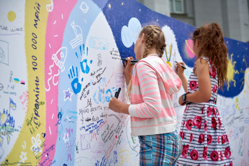 Сотни маленьких мечтателей приехали нарисовать свою мечту уже в день открытия арт-стены. Среди них и пациенты Охматдета, и подопечные Артека, а также общественных и благотворительных организаций. Самая популярная мечта в завершение первого дня работы инсталляции – мечта о единорогах и розовых пони, о путешествиях, об успешной сдаче ЗНО, а еще – о домашних любимцах и про мир в Украине.