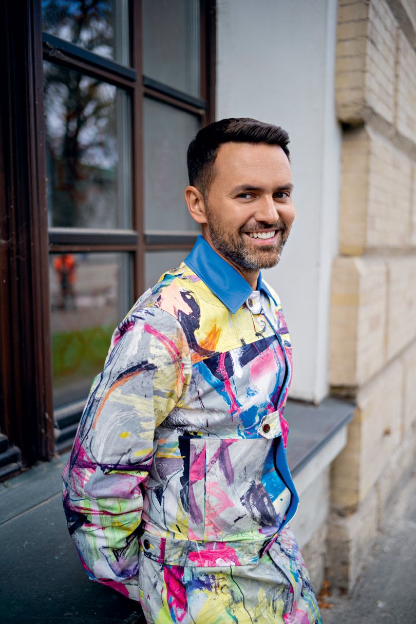 Колаж на комбінезоні телеведучого, виконаний у гарячо-жовтих кольорах із зображенням людей і силуетів, про пошук і віру, про те, що кожен знайде в житті своє найцінніше – місце, справу, кохання.