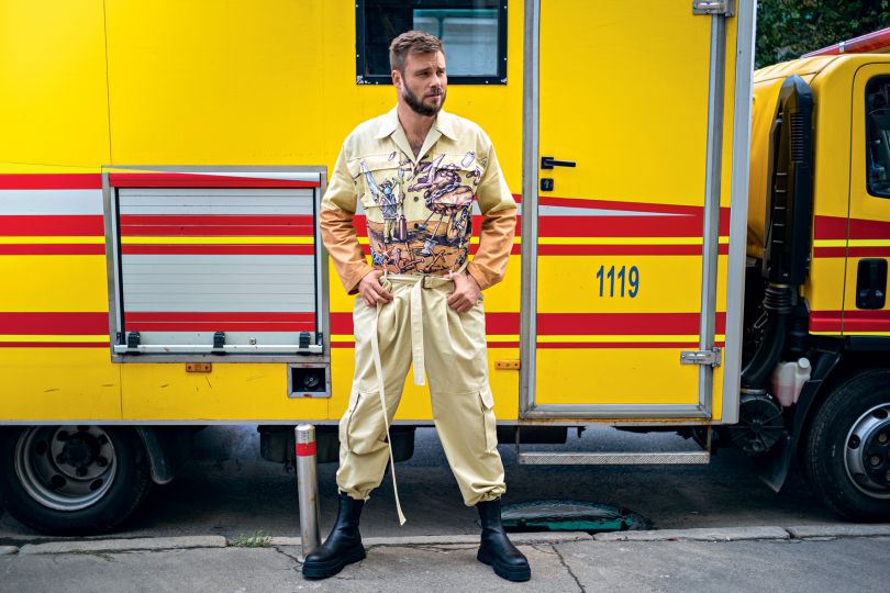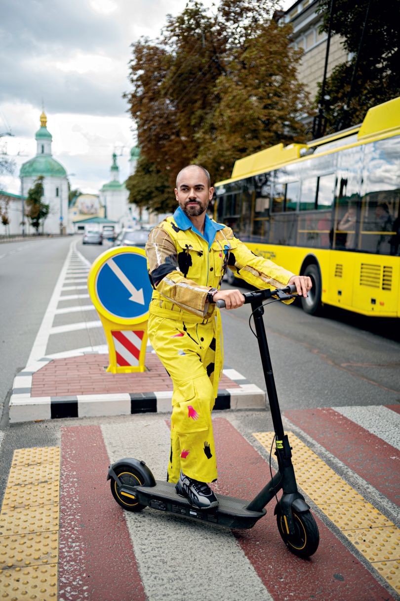 На комбінезоні Єгора залізні роботи – фрагмент фрески з фасаду магазину біля Житнього ринку відомого київського мураліста Дмитра Фатума.